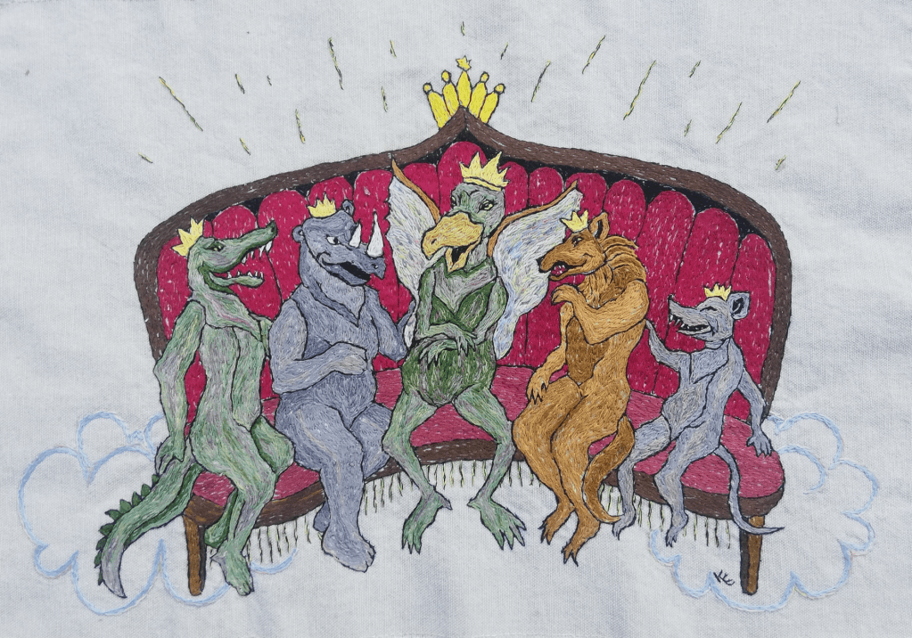Velkommen til en utstilling med tegninger og akvareller av Bodil Solbjør Aurbakken, og broderte fortellinger av Kristin Dorothea Eidem.