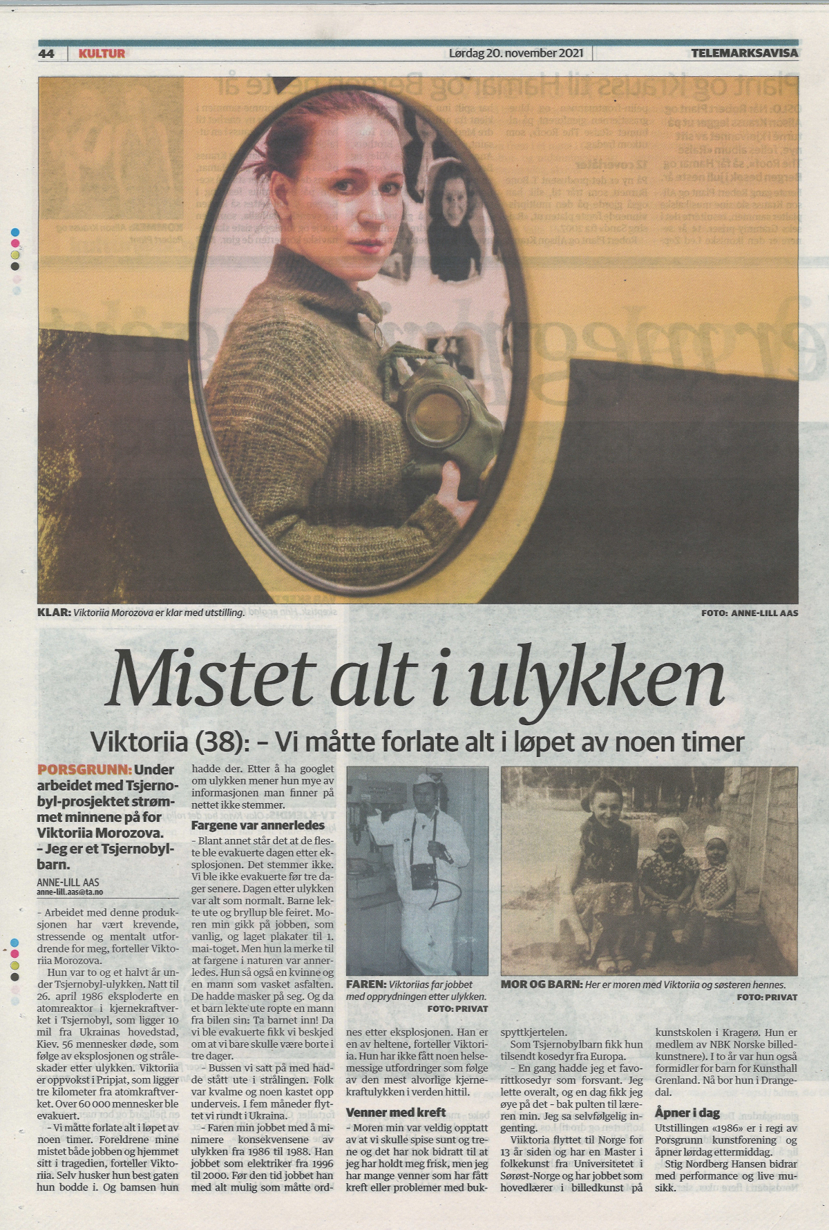 Viktoriia Morozova vokste opp i Chernobyl, og var et barn da ulykken skjedde. Denne utstillingen gjenspeiler hennes personlige reise gjennom minner og refleksjoner, gjennom familiens fortellinger og studier av et dokumentarisk materiale om ulykken.